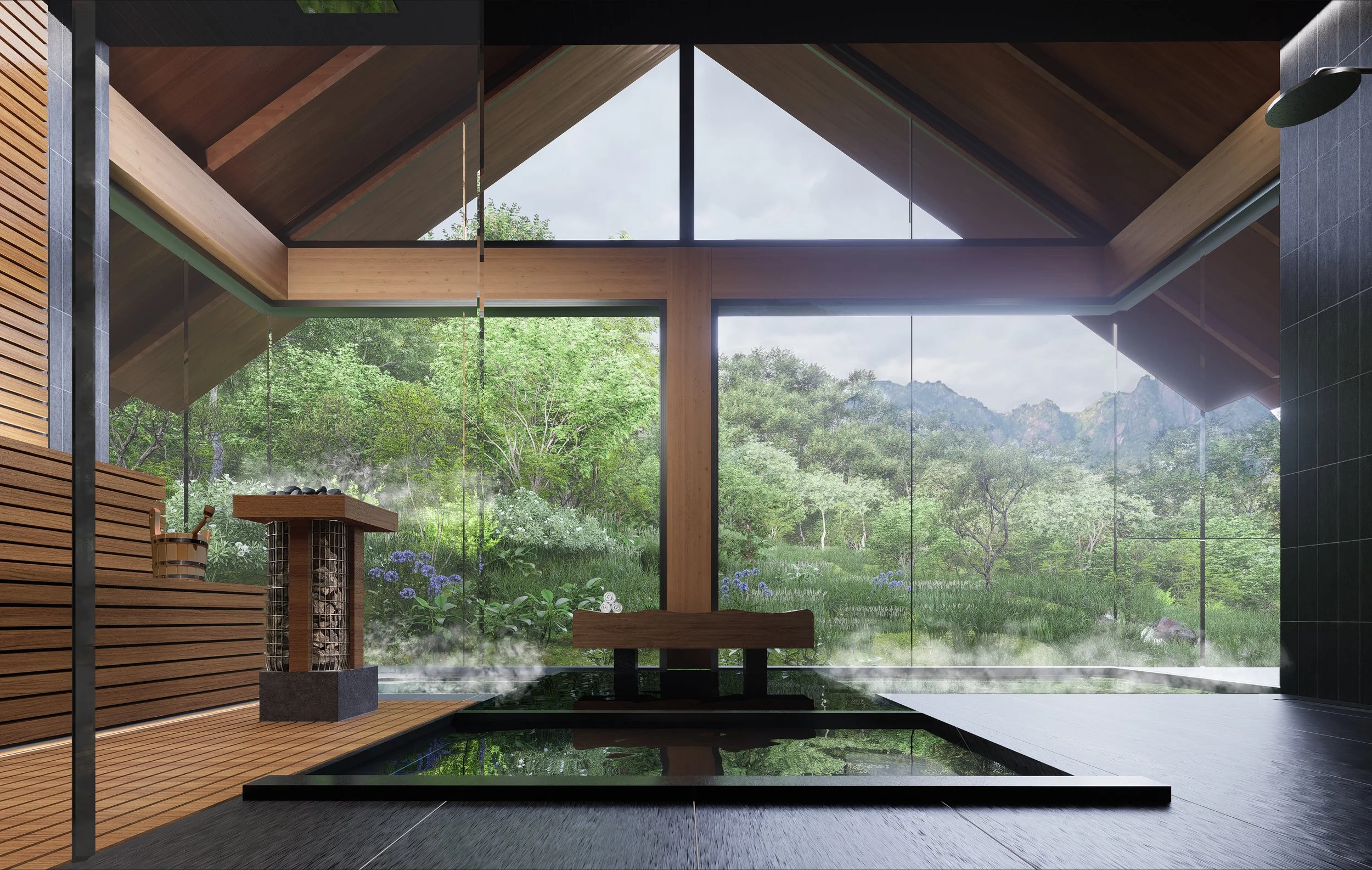 One’s connection with water is further enhanced through strategically positioned reflection pools, swimming pool and the suite of temperature baths, along with the aquatic garden, creating a continuous water link with the site’s existing ponds and streams, to anchor and integrate the architecture’s low-height and gable roof with the site’s surroundings and sensibility towards the climate.